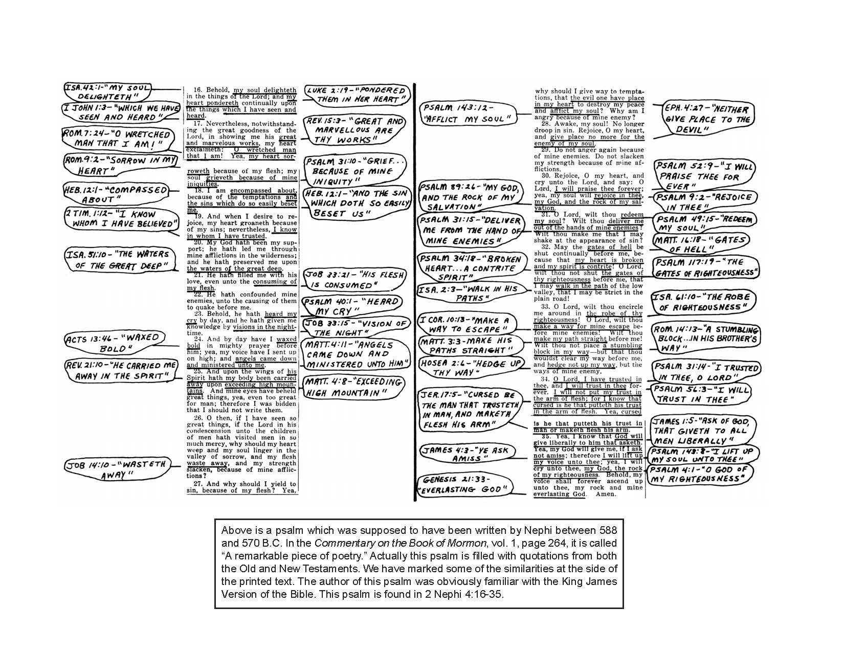 This is the most obvious example of intertextuality between the New Testament and the Book of Mormon inspired by a single passage, but there are many many others. A more complex but striking example is this one from Jerald and Sandra Tanner’s book Joseph Smith’s Plagiarism of the Bible in the Book of Mormon which shows how Nephi’s psalm from 2 Nephi 4 depends heavily on both Old Testament and New Testament texts.