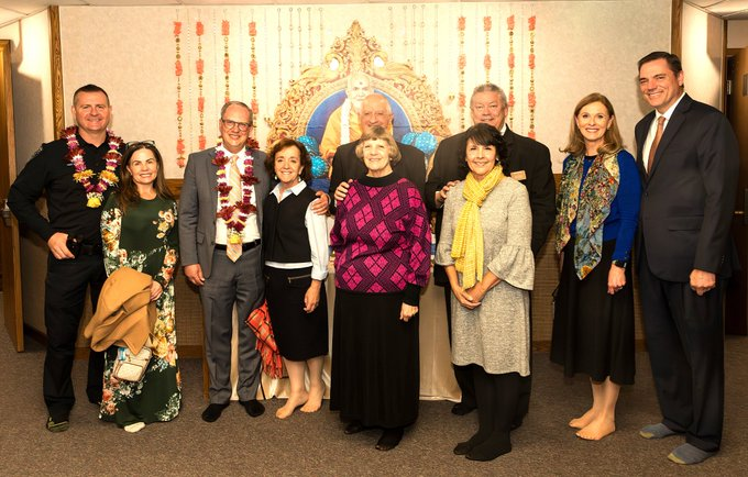 Leaders posed for pictures in front of an altar for the BAPS leader. BAPS members consider this leader to be a guru, a perfect devotee of the God Akshar, and one whom Akshar resides in.